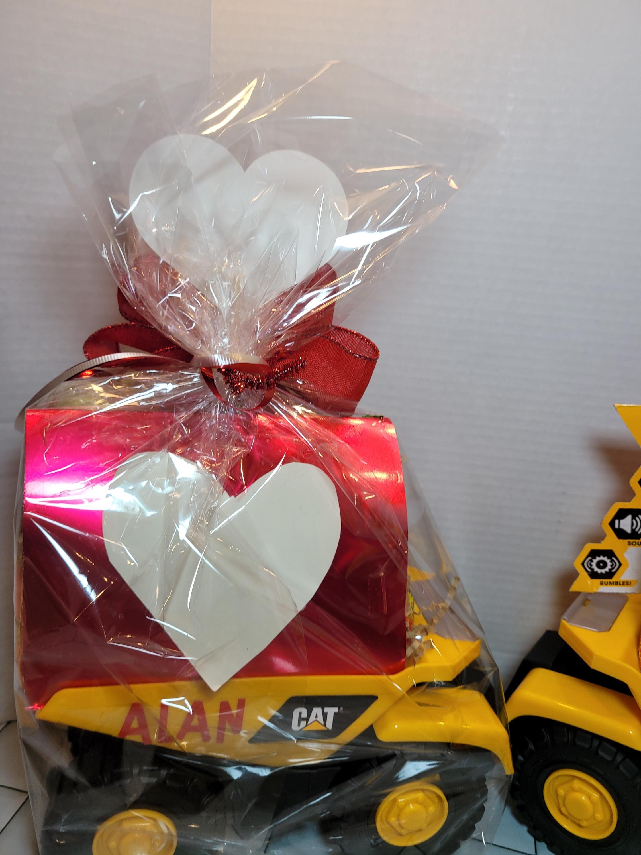The gift will come wrapped in cellophane paper, tied with a bow.